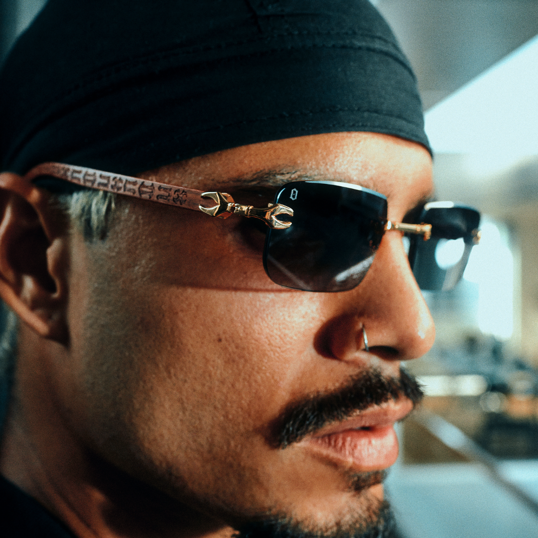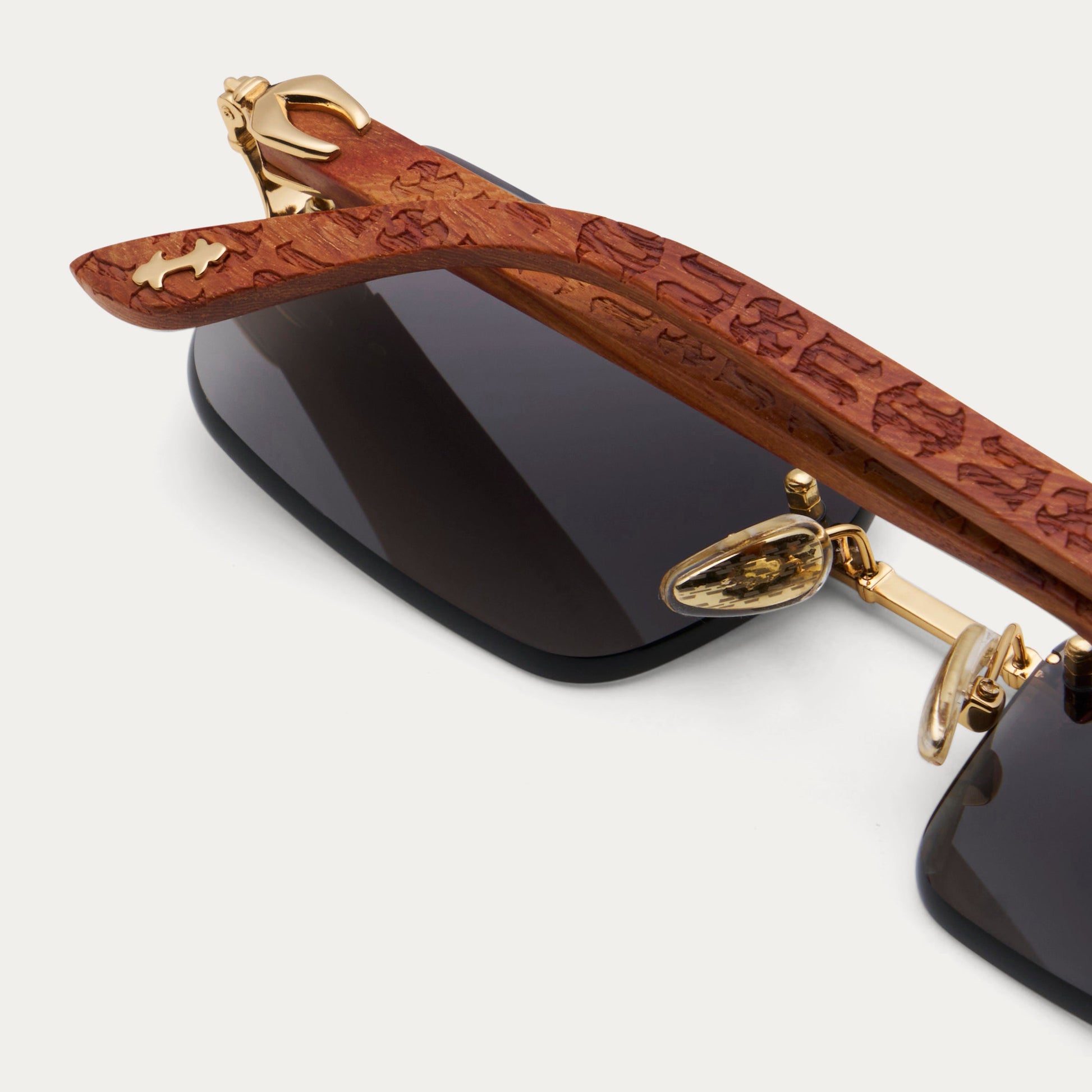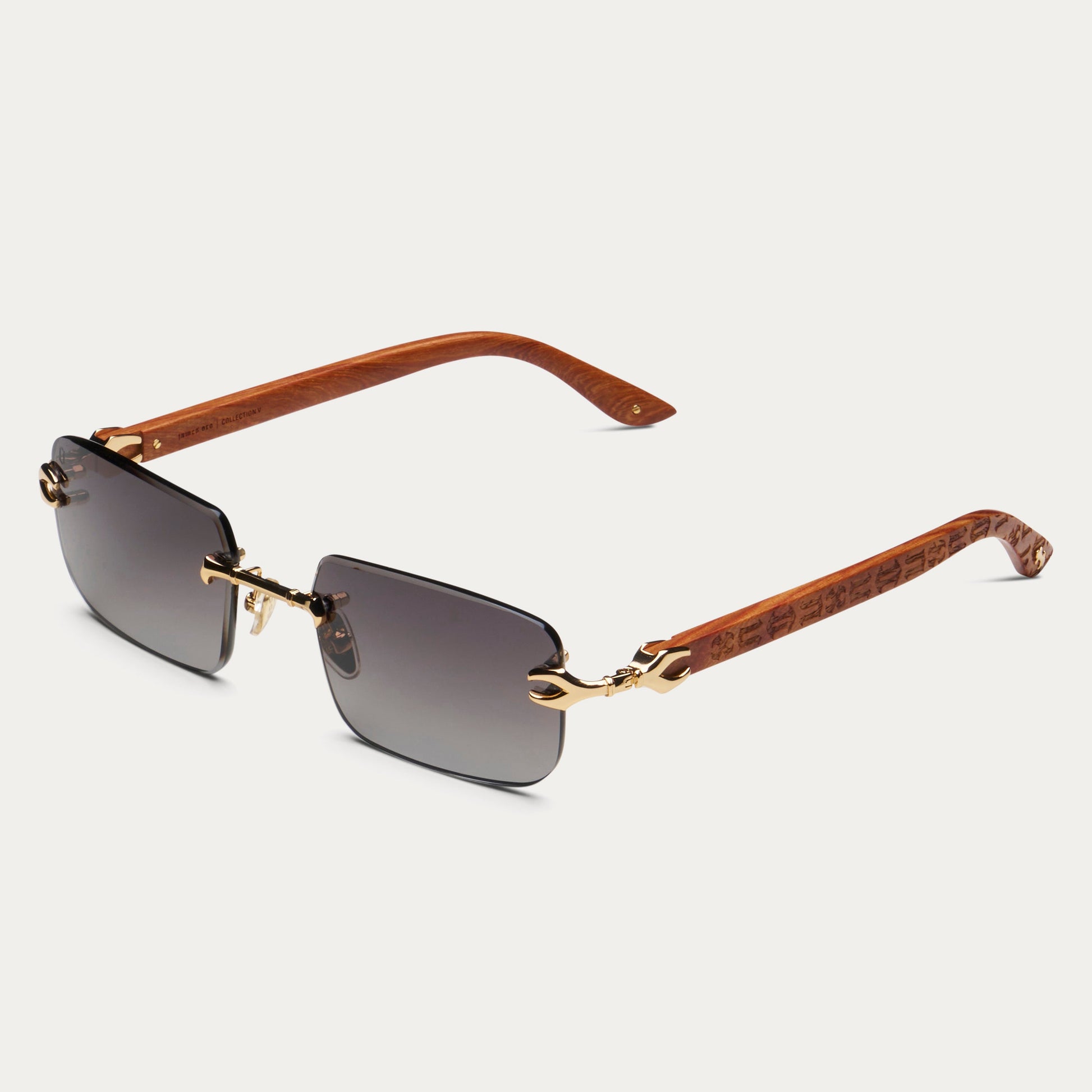 A sophisticated rimless frame with 100% genuine wood temples, featuring custom Oro-branded hieroglyphics engraved into the temples. Enhanced with stainless steel hardware and semi-beveled lenses for ultimate clarity and a refined touch of detail.