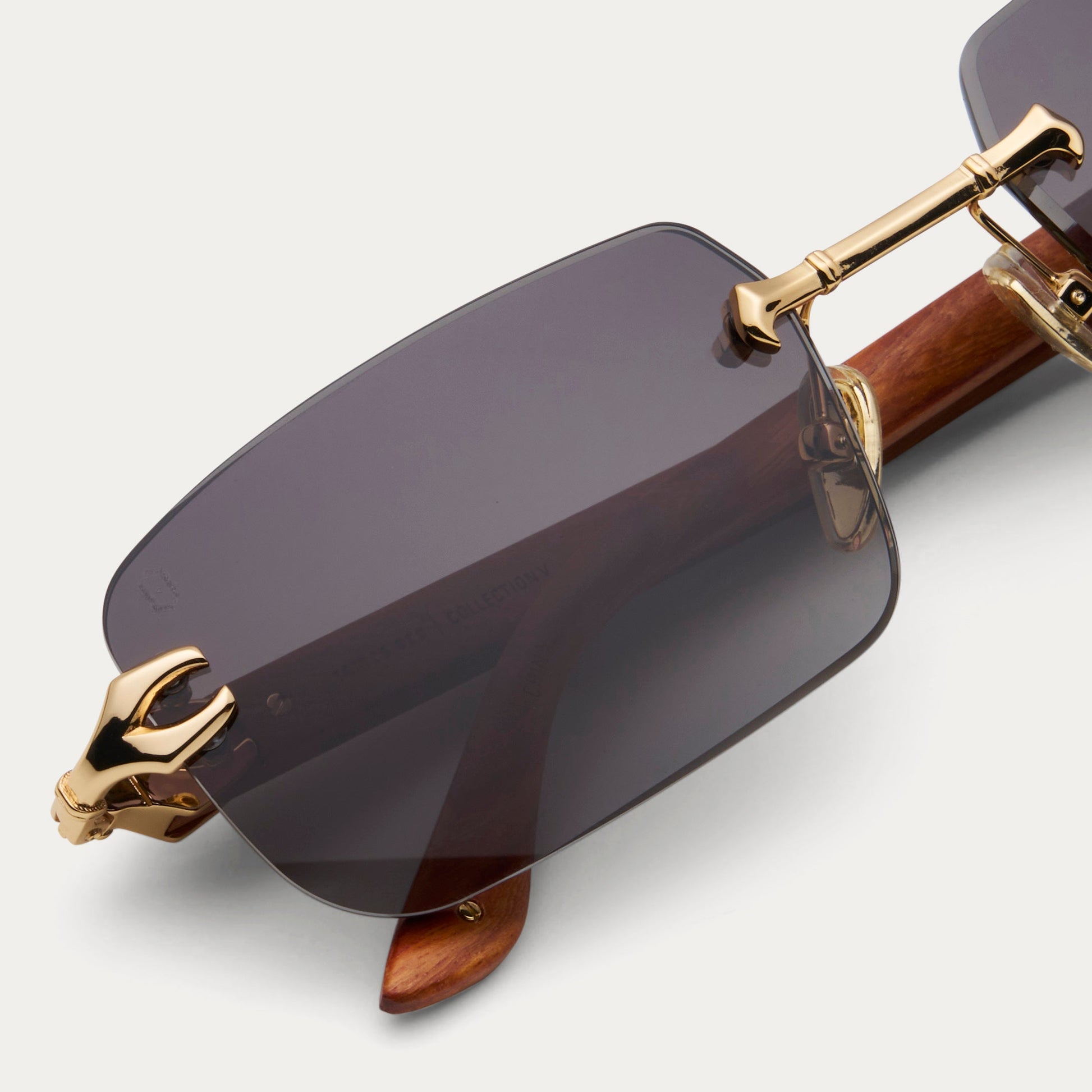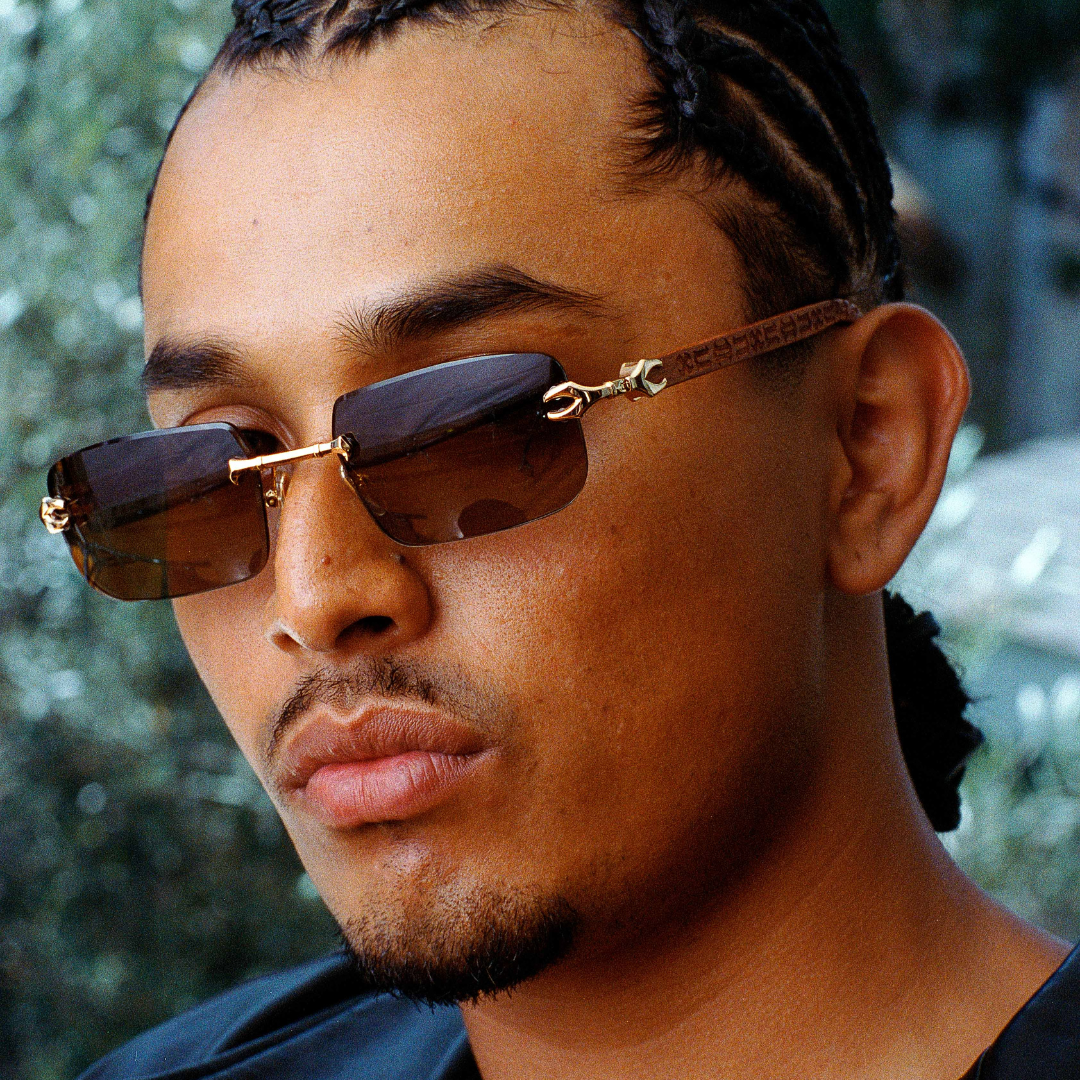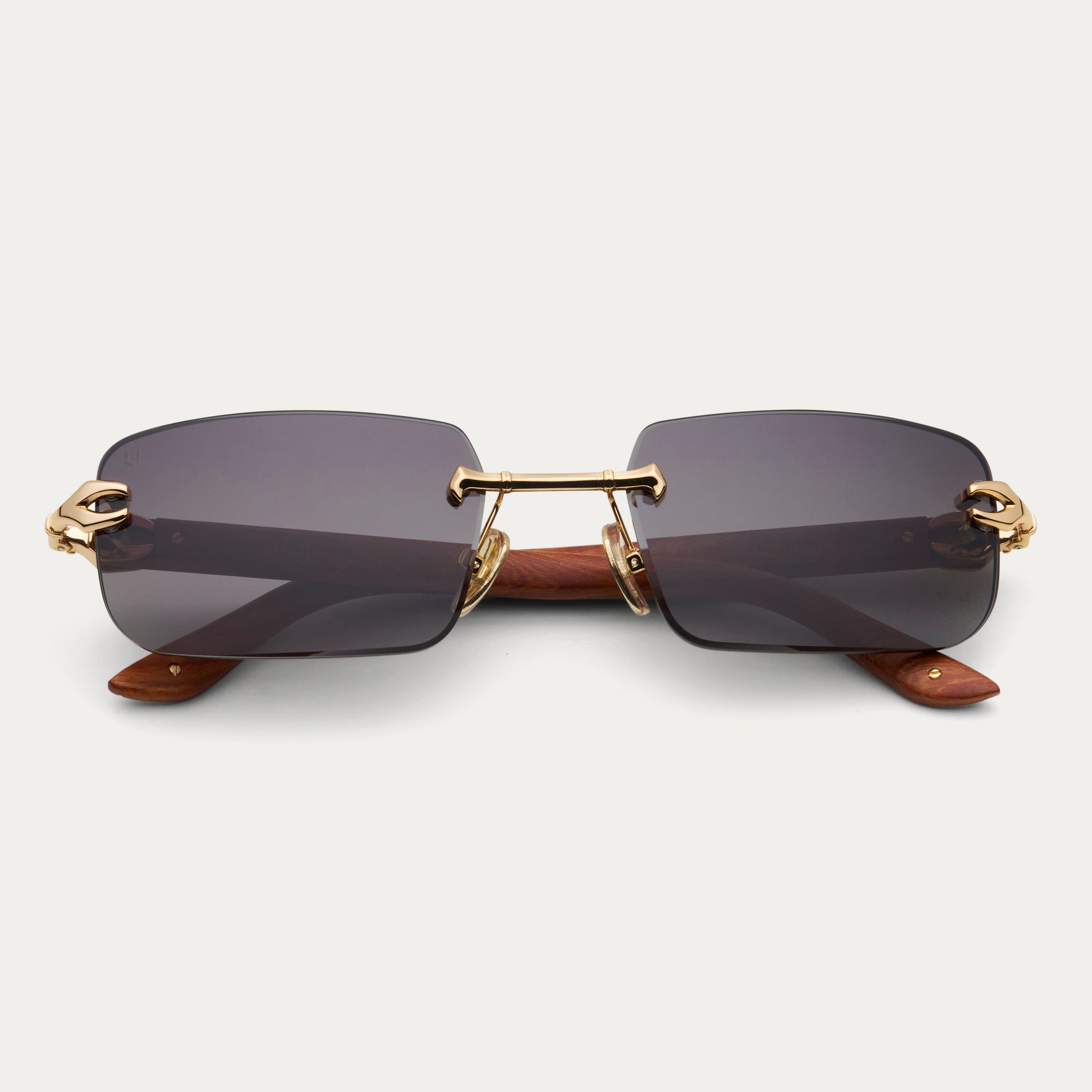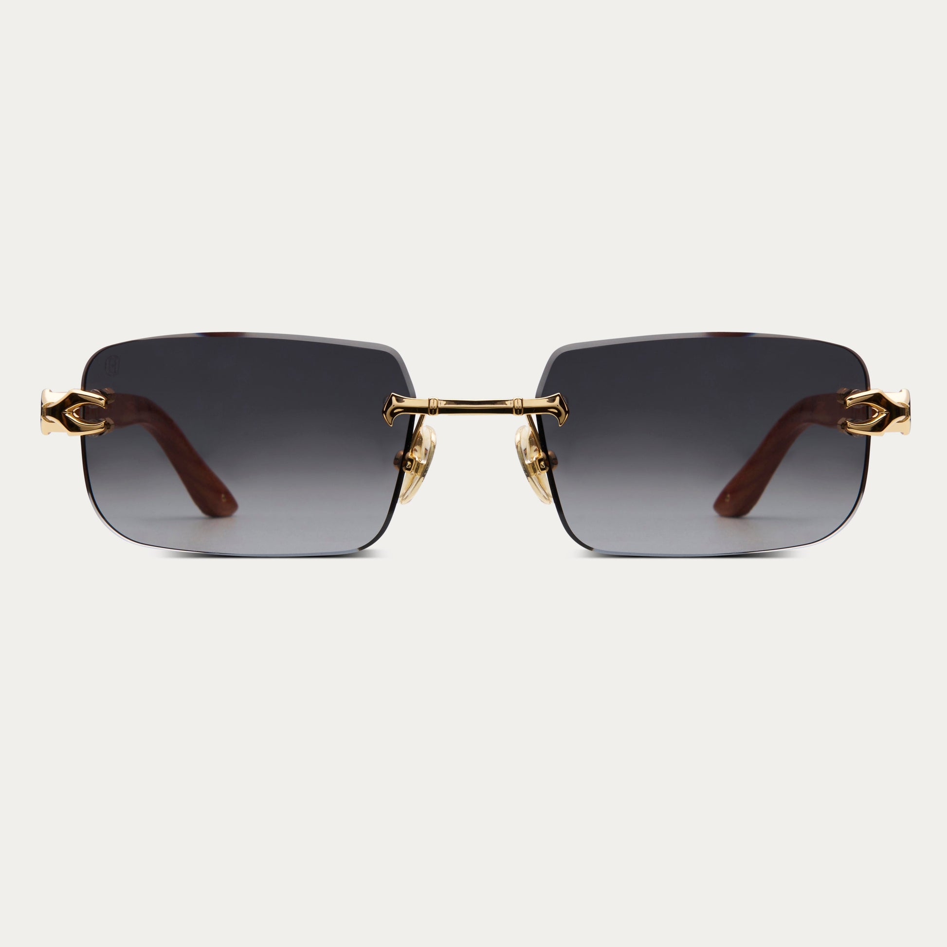 A sophisticated rimless frame with 100% genuine wood temples, featuring custom Oro-branded hieroglyphics engraved into the temples. Enhanced with stainless steel hardware and semi-beveled lenses for ultimate clarity and a refined touch of detail.