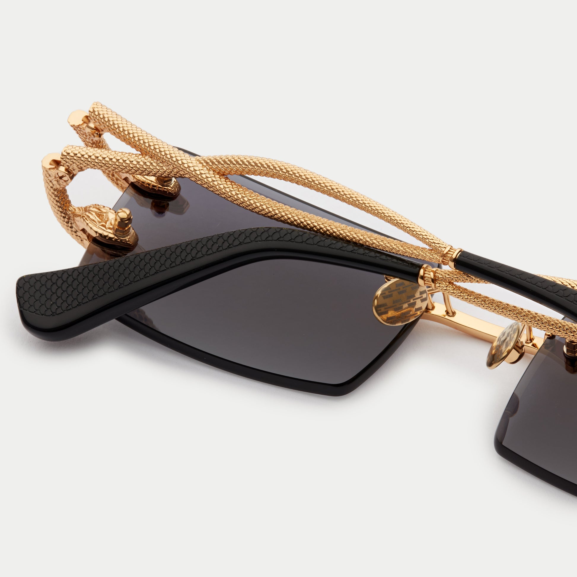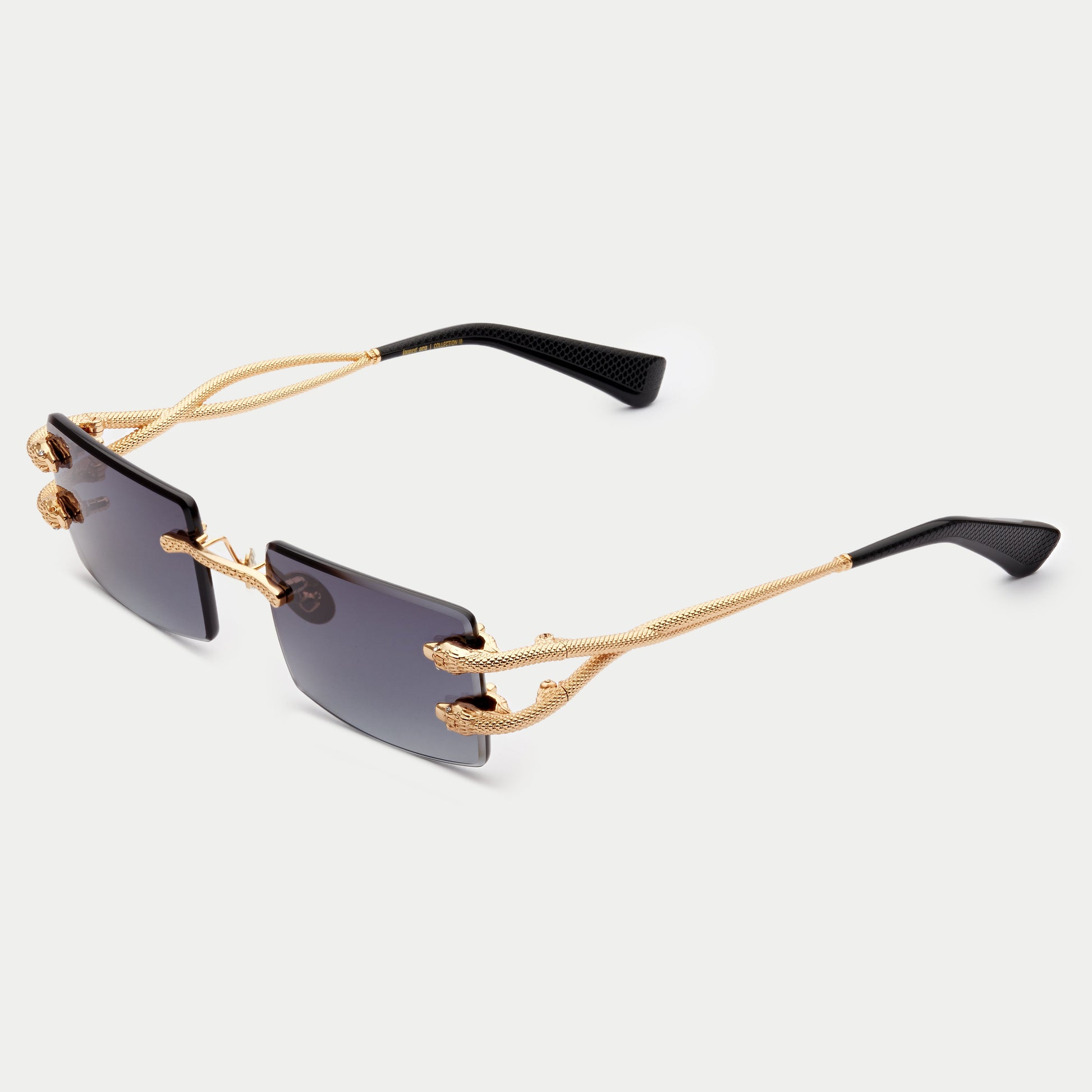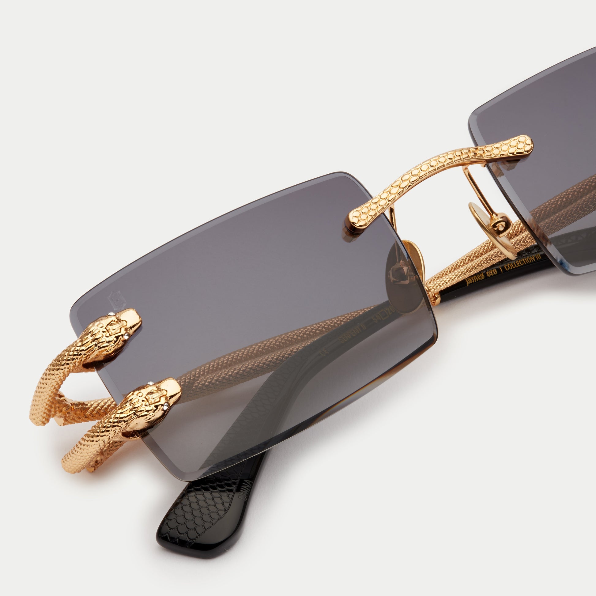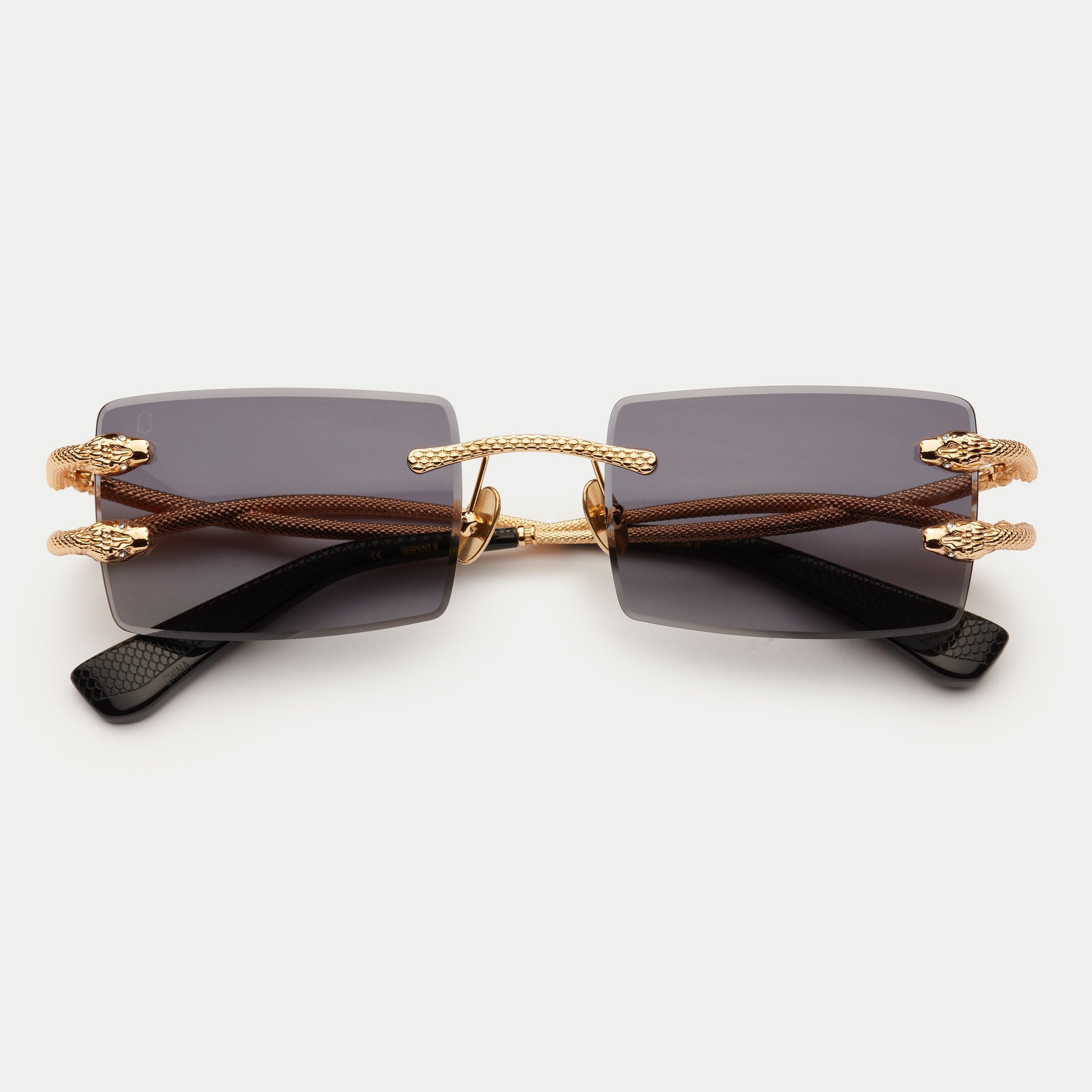 The Serpent II continues James Oro’s famous serpent design, with two coiling snakes biting the rimless lens. Stainless steel construction and laser-engraved serpent scales on the temple tips bring a refined and bold update to this signature look.