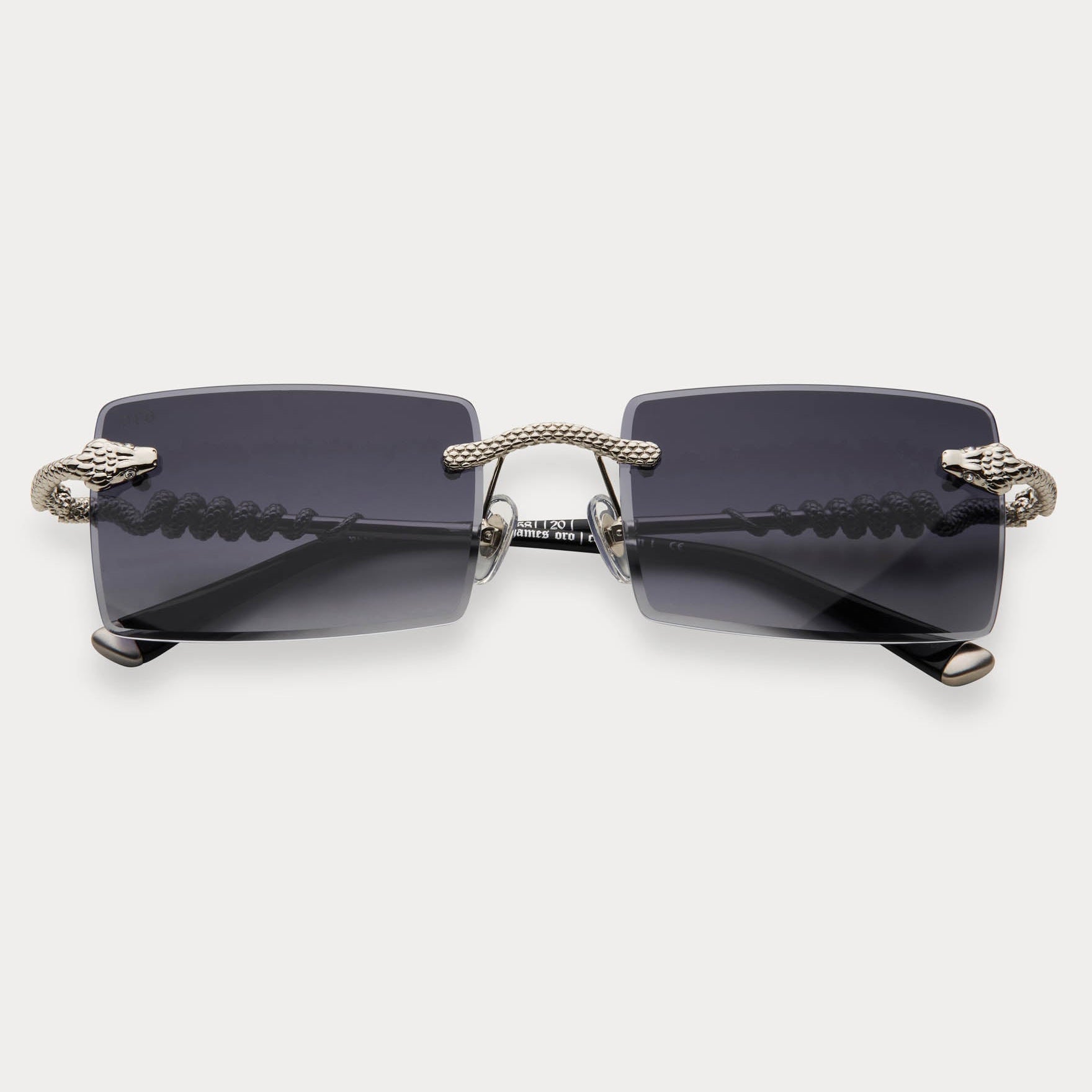 An iconic design from James Oro’s premier collection, the Serpent frames feature a coiling snake around the stainless steel temple, with the snake's head biting the rimless lens. Detailed craftsmanship and white stone eyes complete this statement frame.