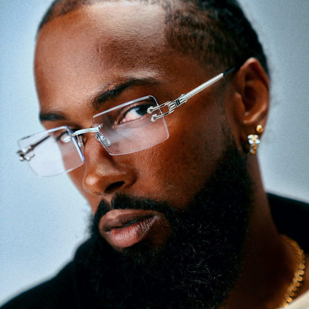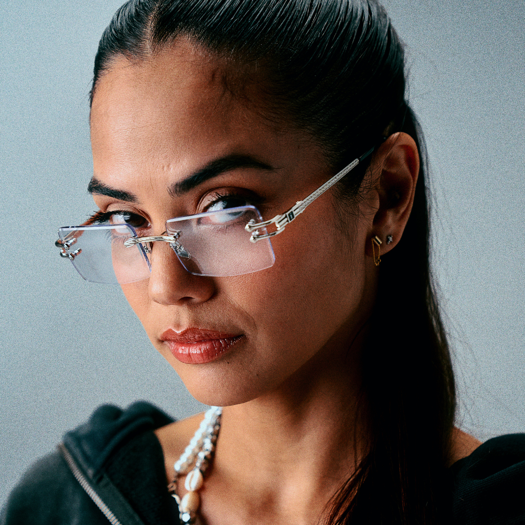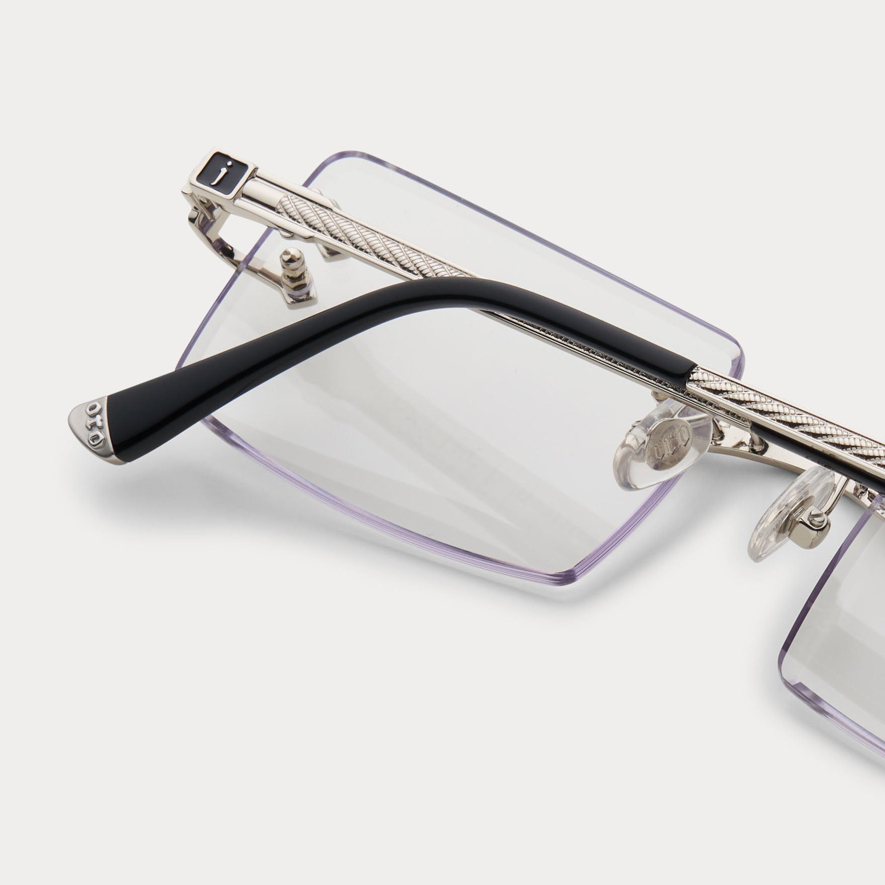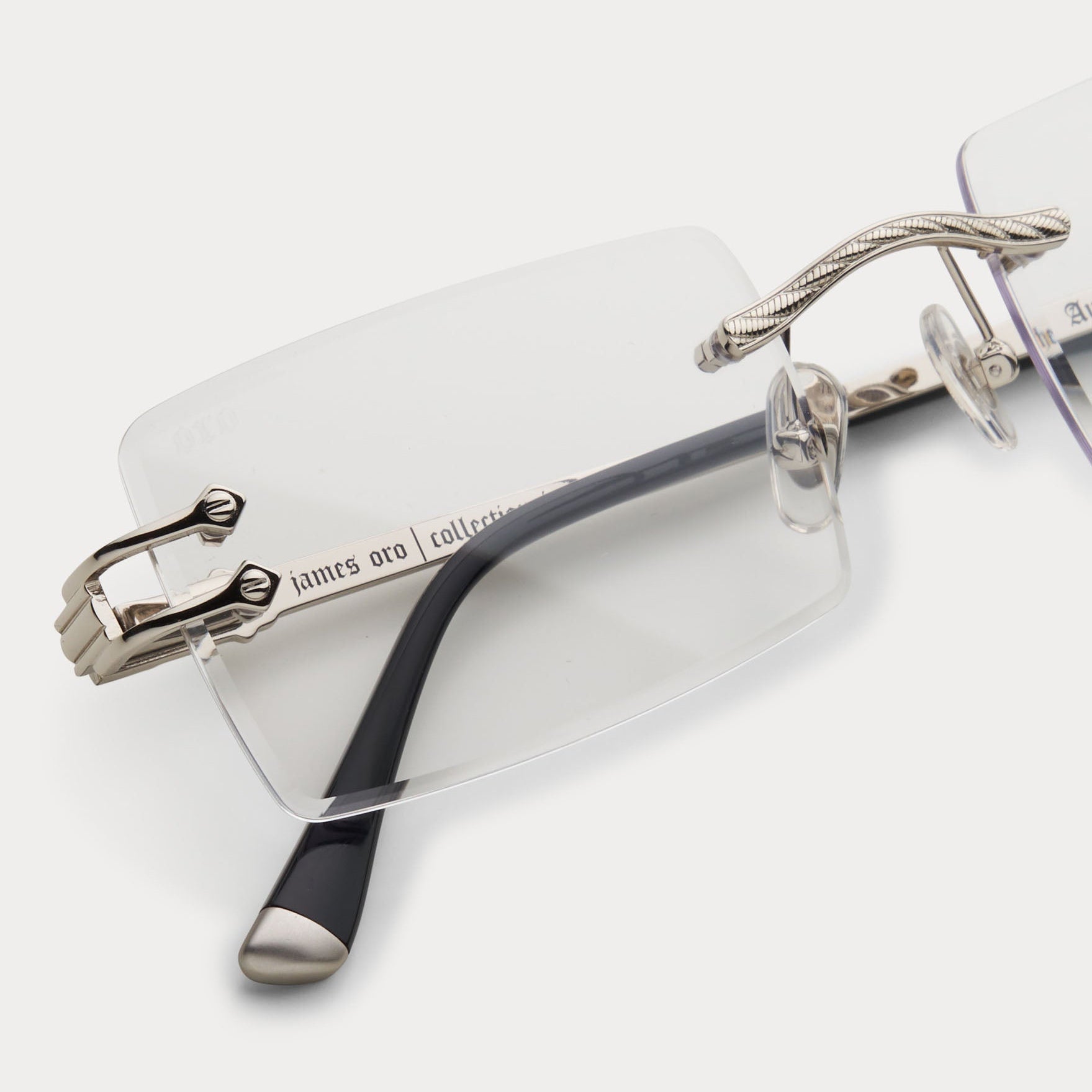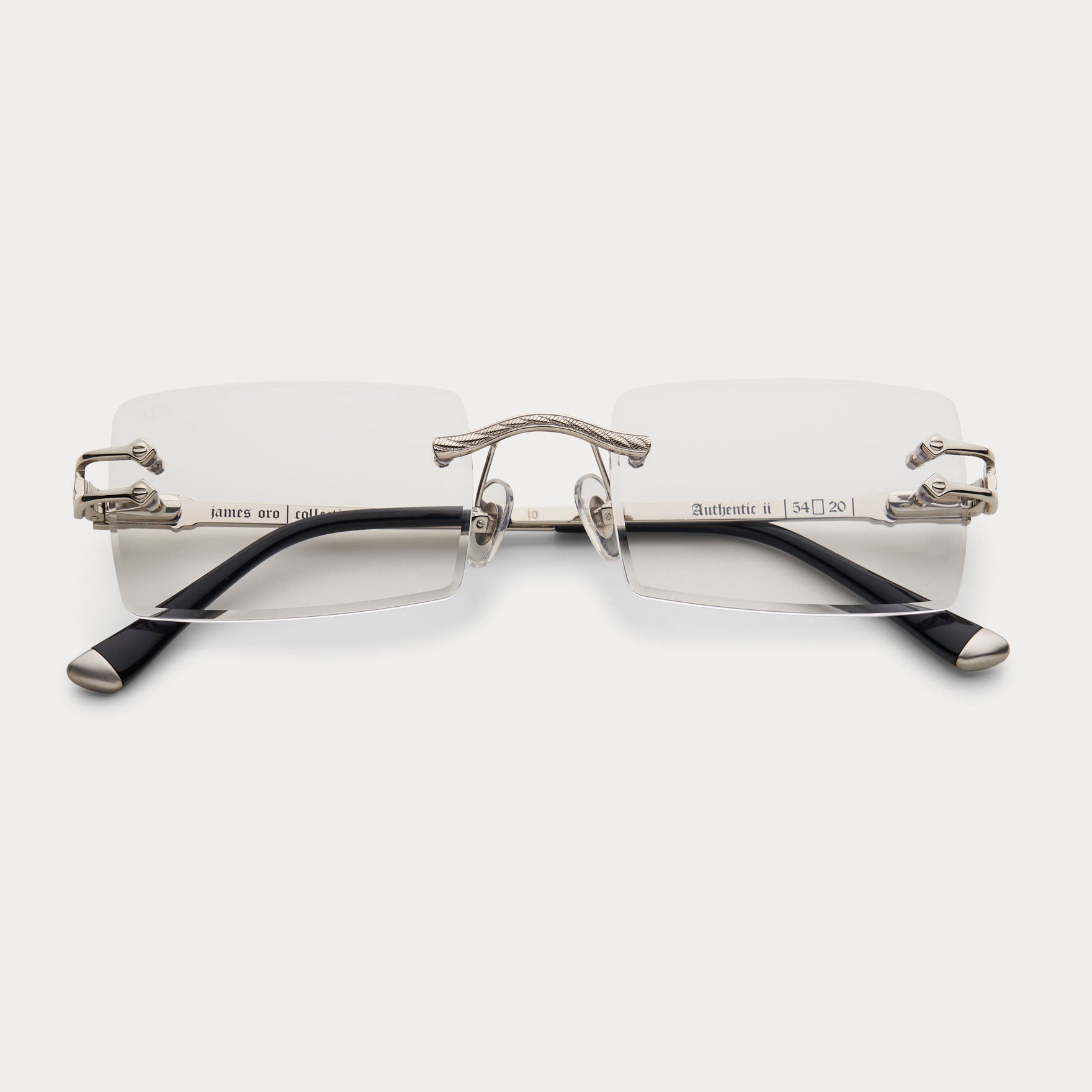 Meet a modern classic: An iconic rectangular rimless frame, the sleek Authentic II by James Oro comprises our signature "diamond" bevel-edge lens cut and logo-embossed tips. The frame is designed in 18KT gold or silver dipped iterations, and each temple is adorned with rope chain and logo details.